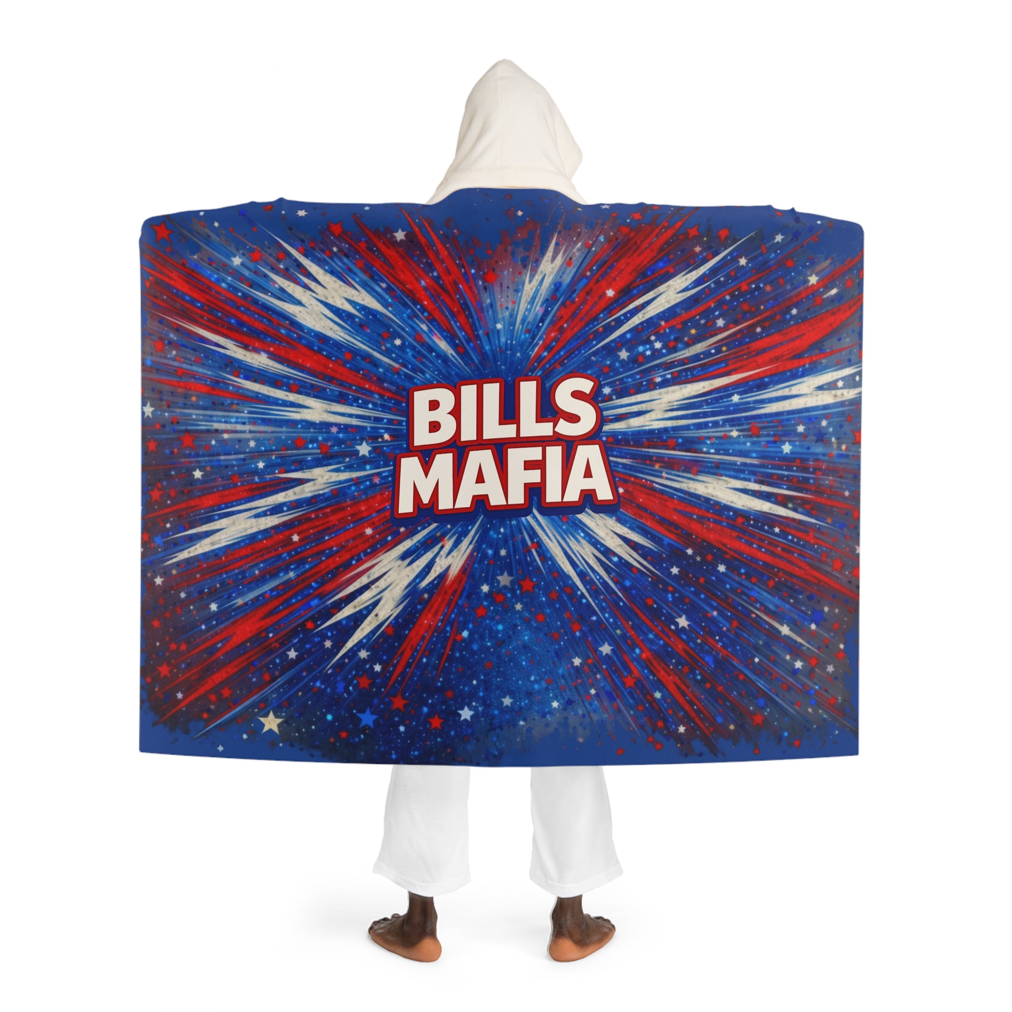 Wrap up in Bills Mafia comfort. This hooded sherpa fleece blanket brings bold red, white, and blue, Bills Energy with cozy sherpa warmth—perfect for game days, cold nights, post-win celebrations, firepits and football Sundays!