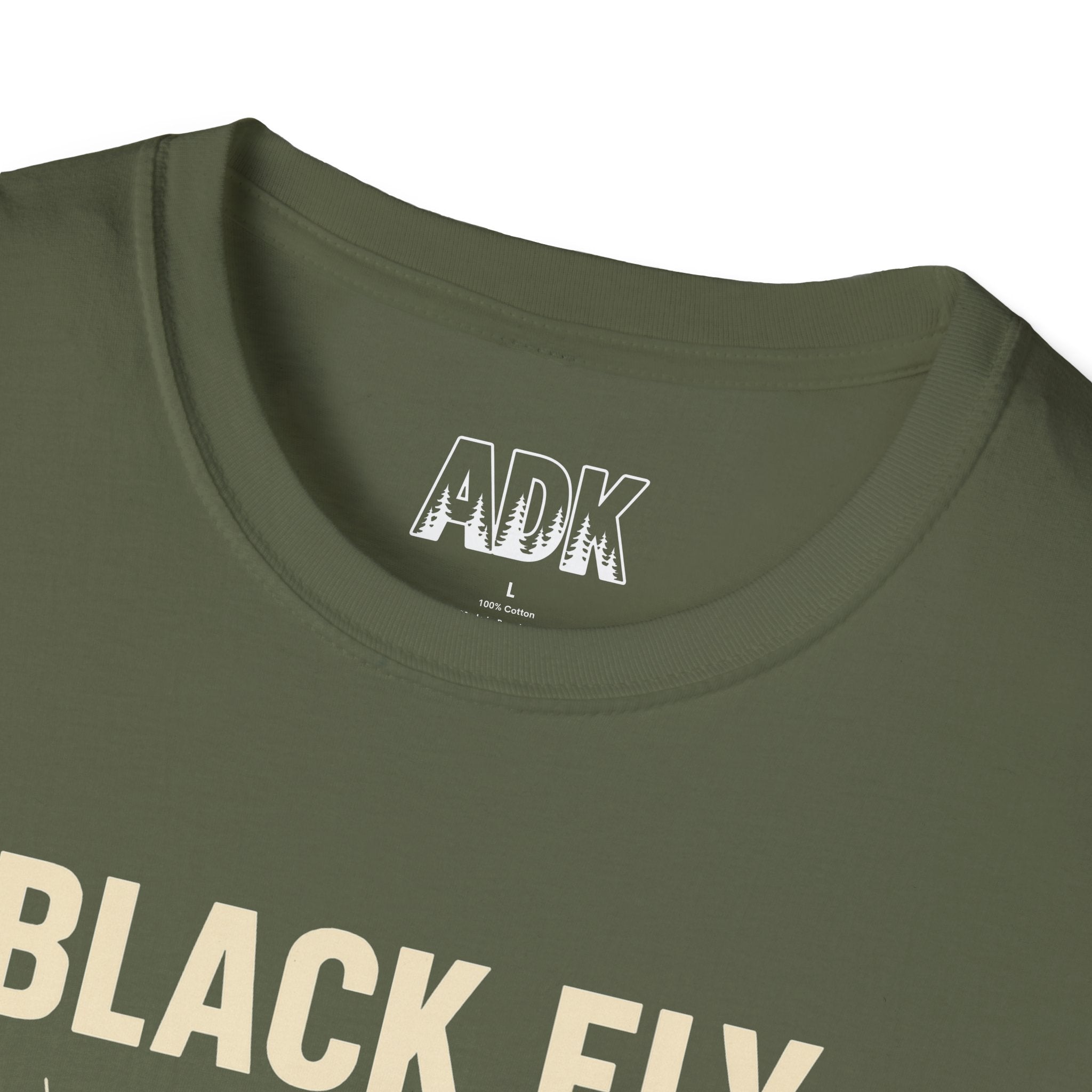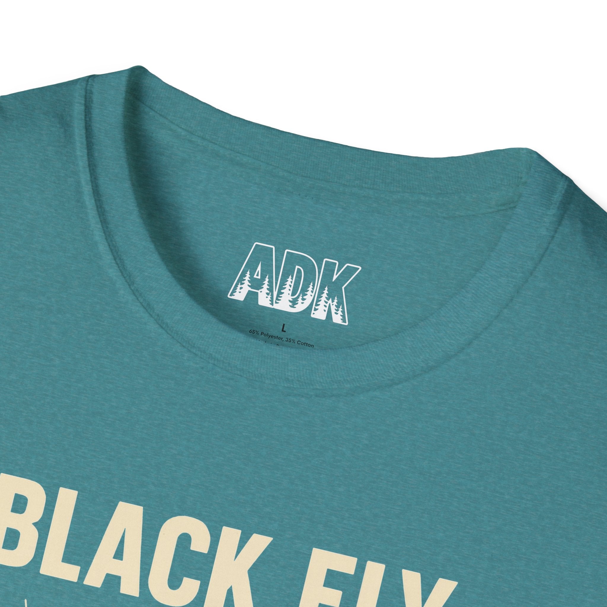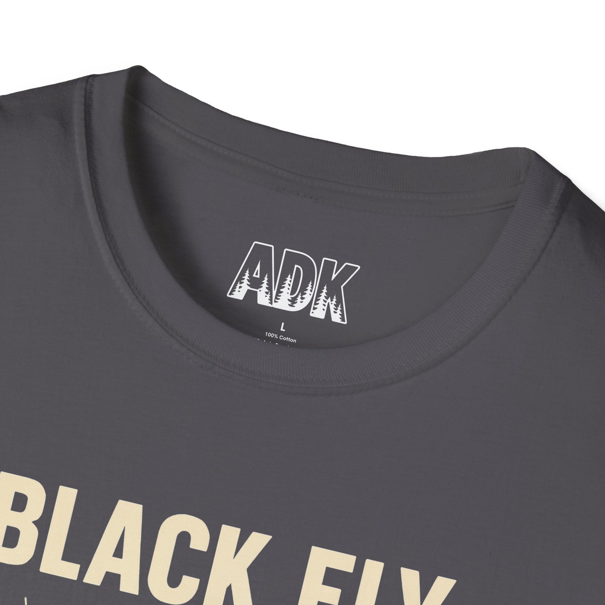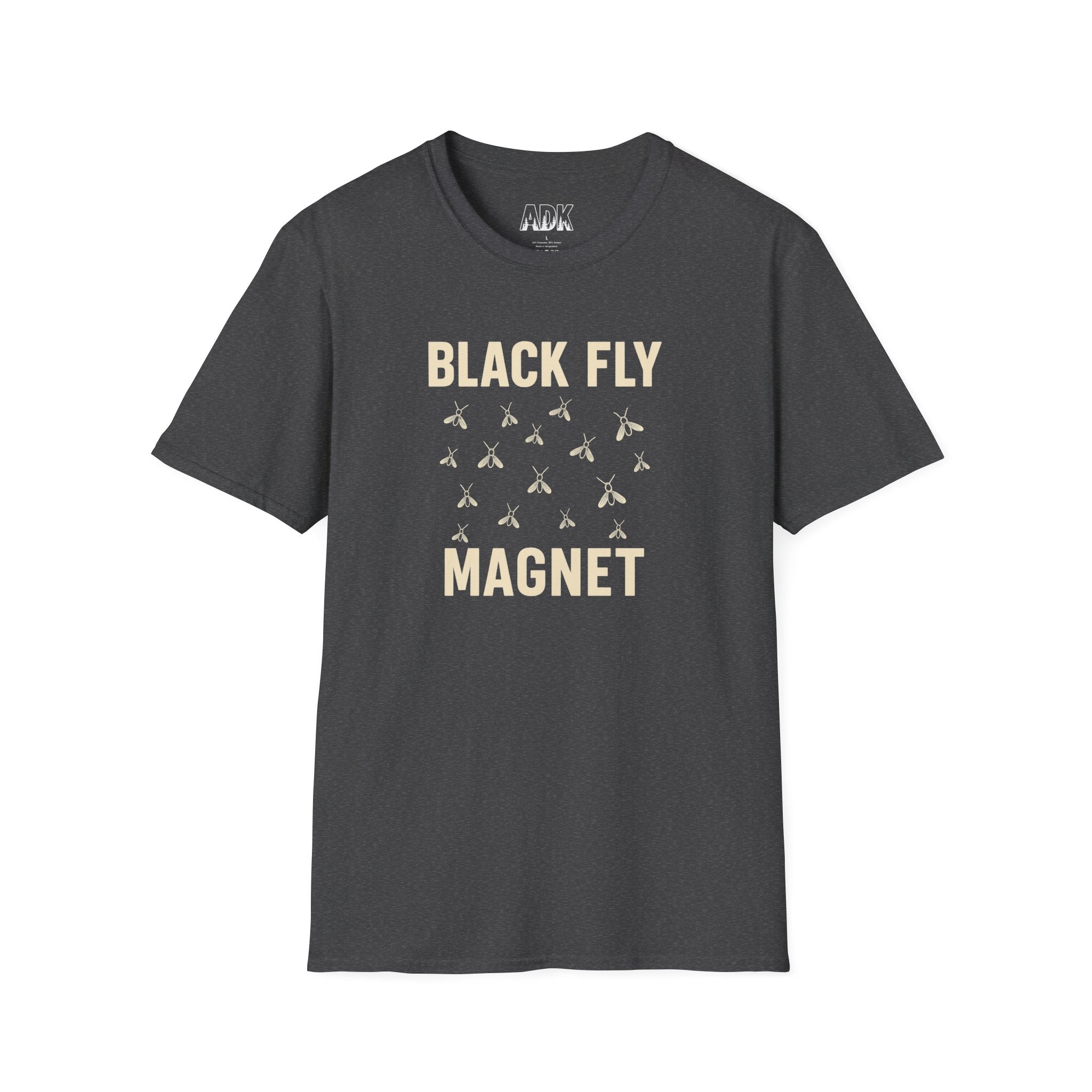 Front Design - Black Fly Magnet - inside label says ADK with pine trees.