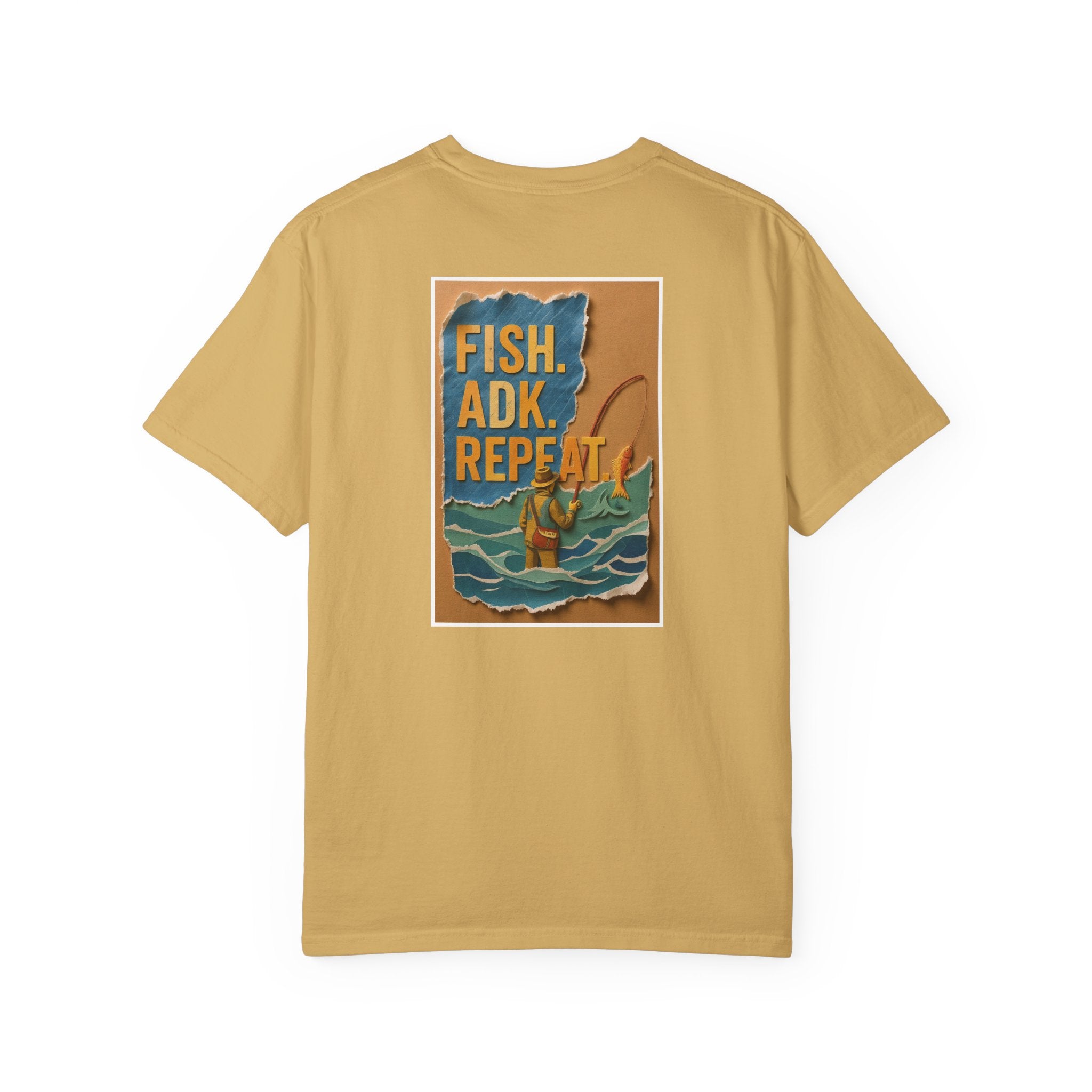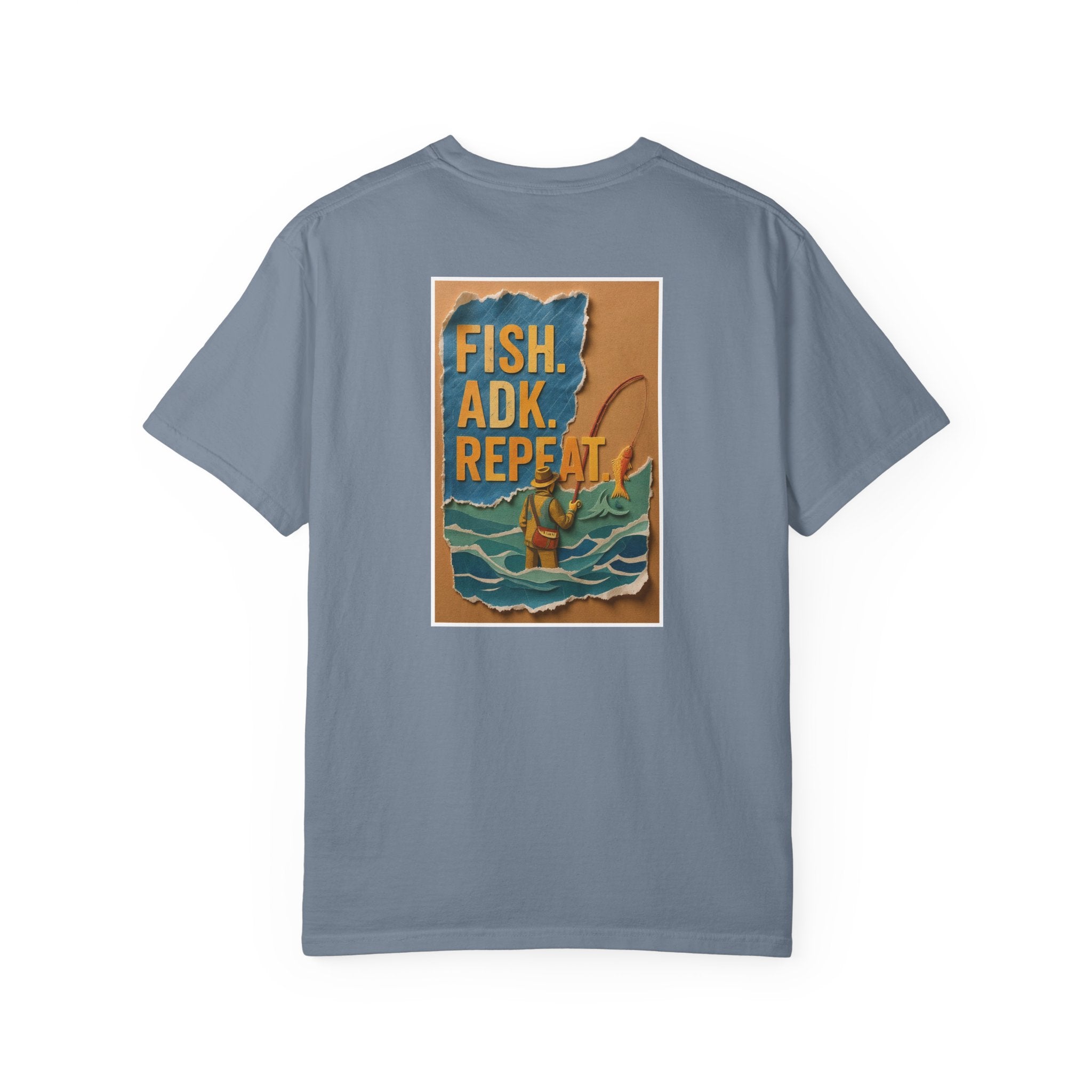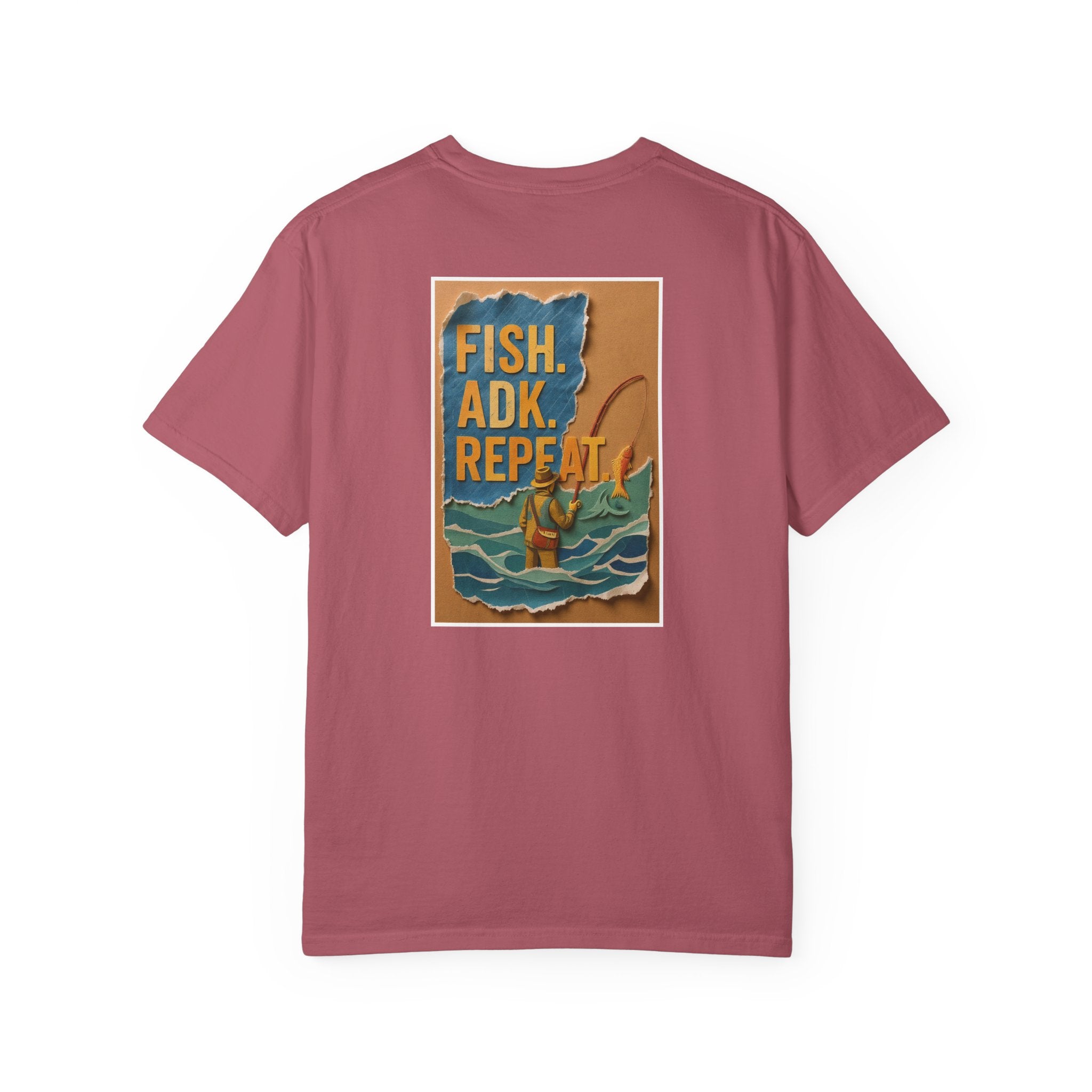 This Comfort Colors, garment-dyed tee carries the easygoing rhythm of a day on the water. Soft, worn-in color and a relaxed fit set the pace. Fish. ADK. Repeat. with Adirondacks on the front and a fishing ADK repeat graphic on the back.