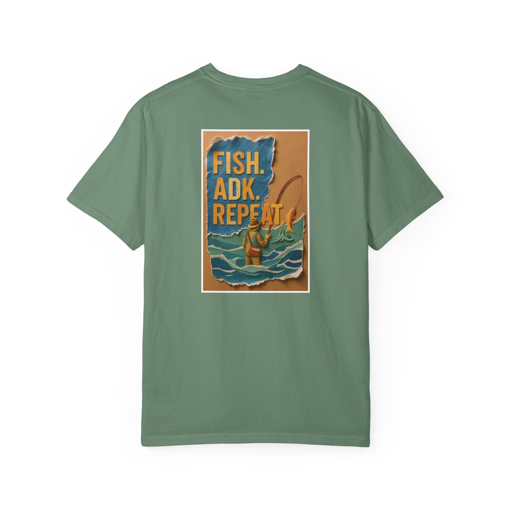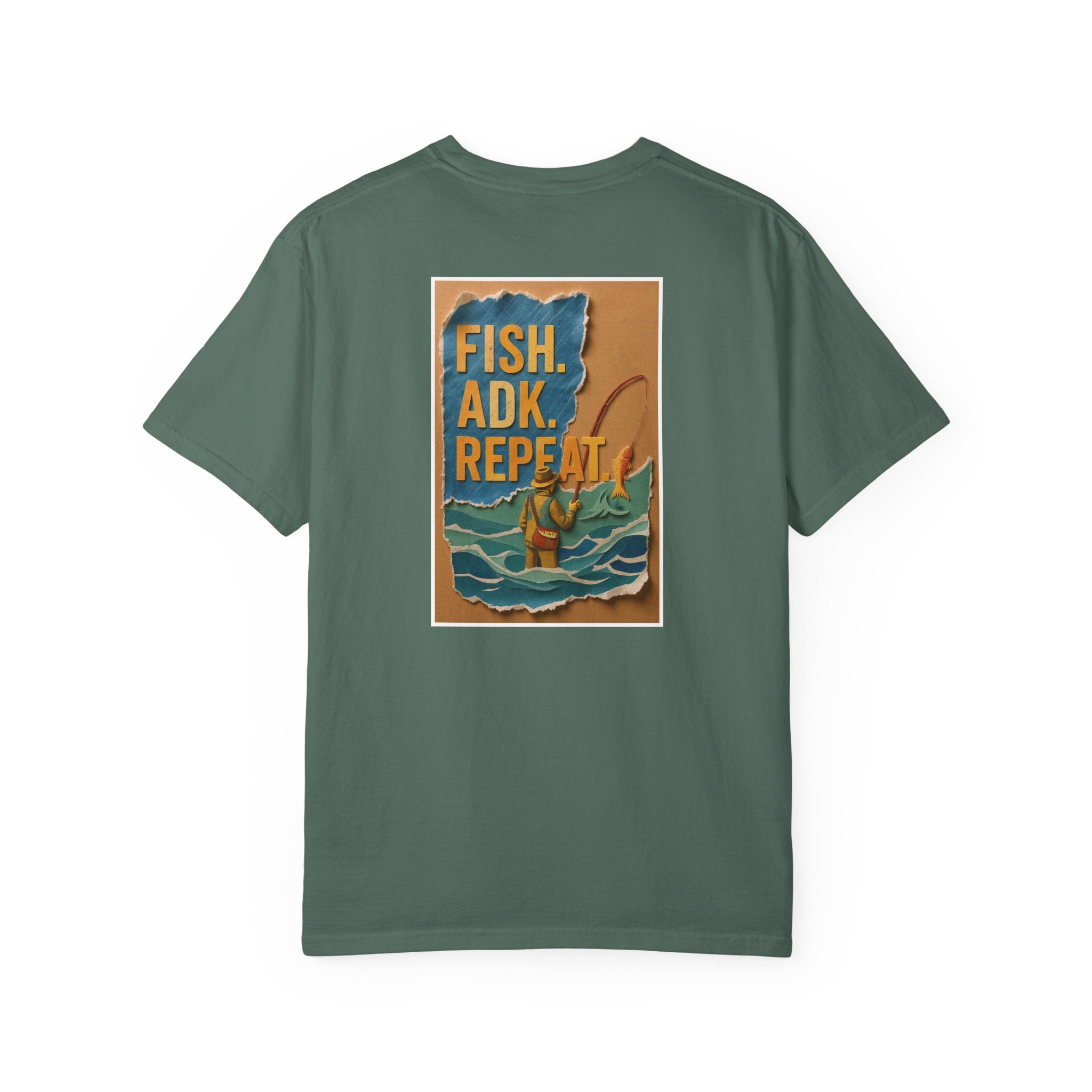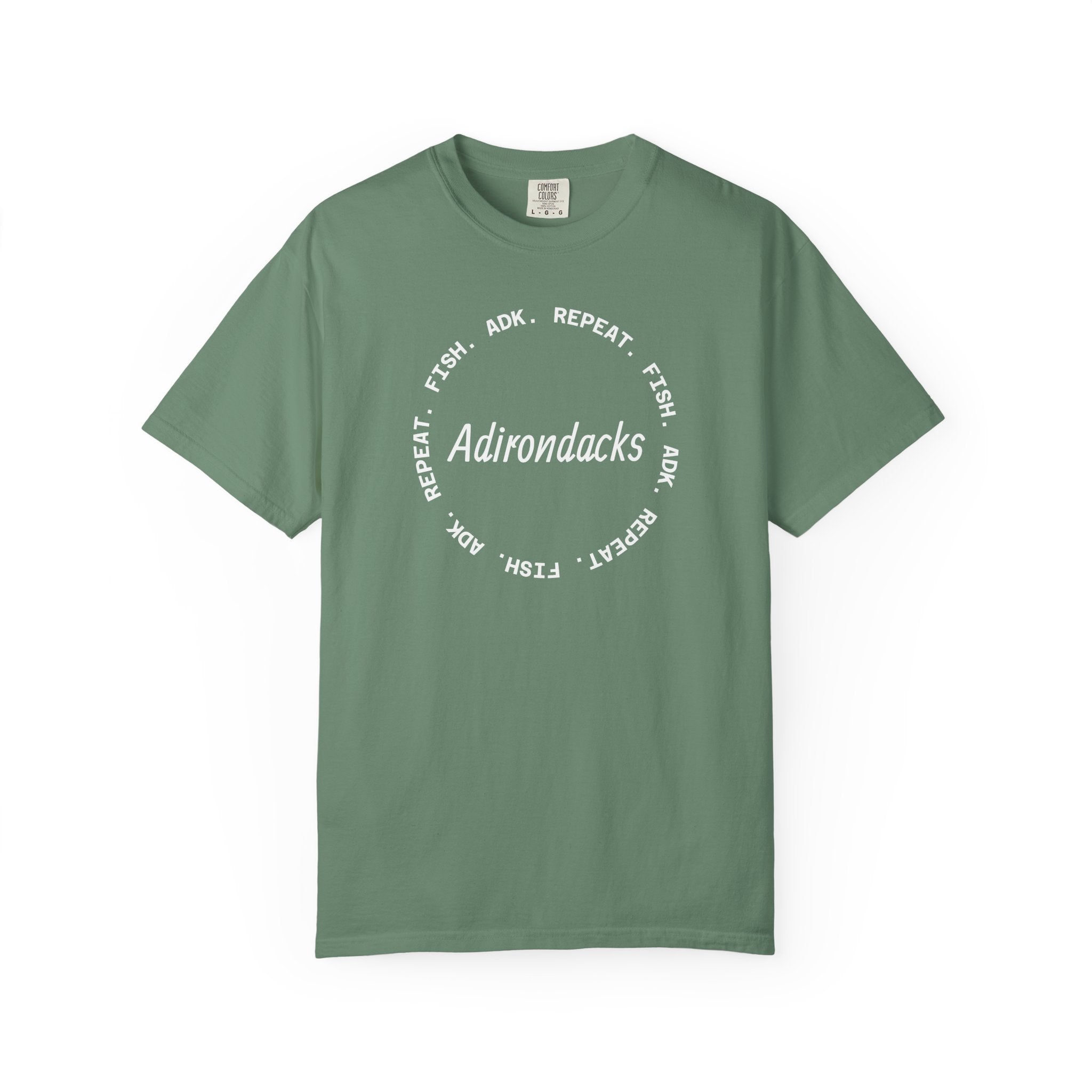 This Comfort Colors, garment-dyed tee carries the easygoing rhythm of a day on the water. Soft, worn-in color and a relaxed fit set the pace. Fish. ADK. Repeat. with Adirondacks on the front and a fishing ADK repeat graphic on the back.