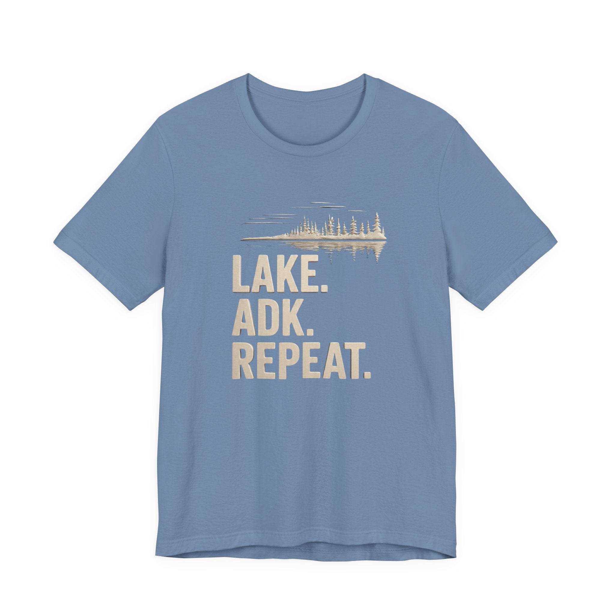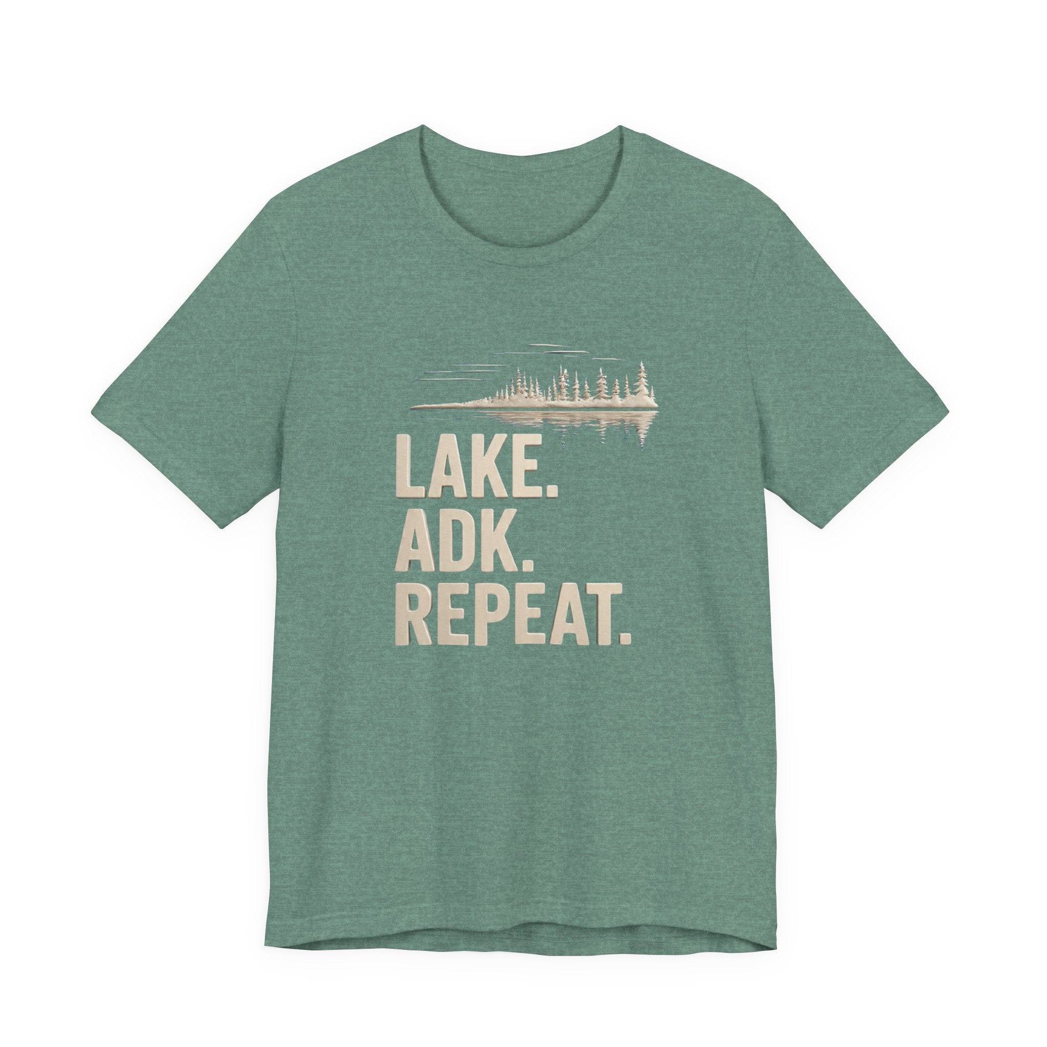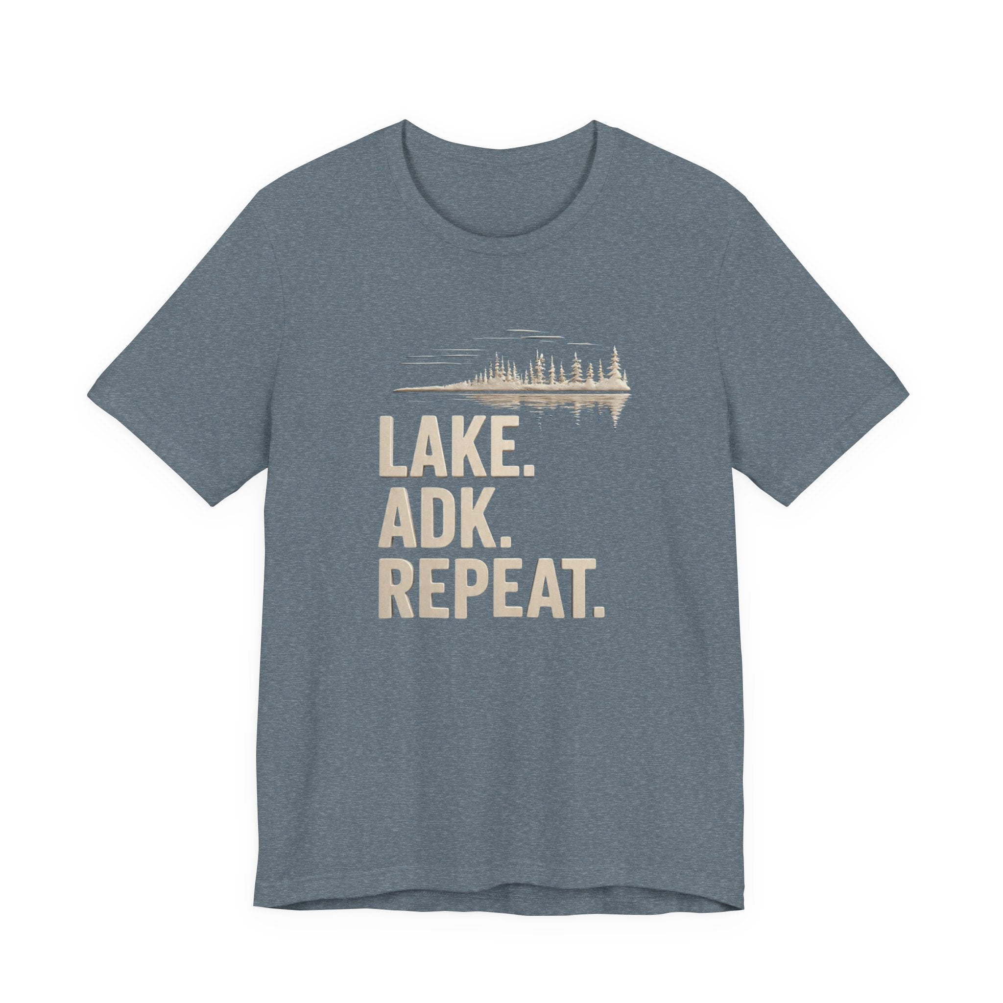 Soft Airlume combed cotton feels breathable against the skin while the vintage-inspired forest-and-water graphic and bold stacked text—LAKE. ADK. REPEAT.—announce where your heart goes when the weekend arrives.