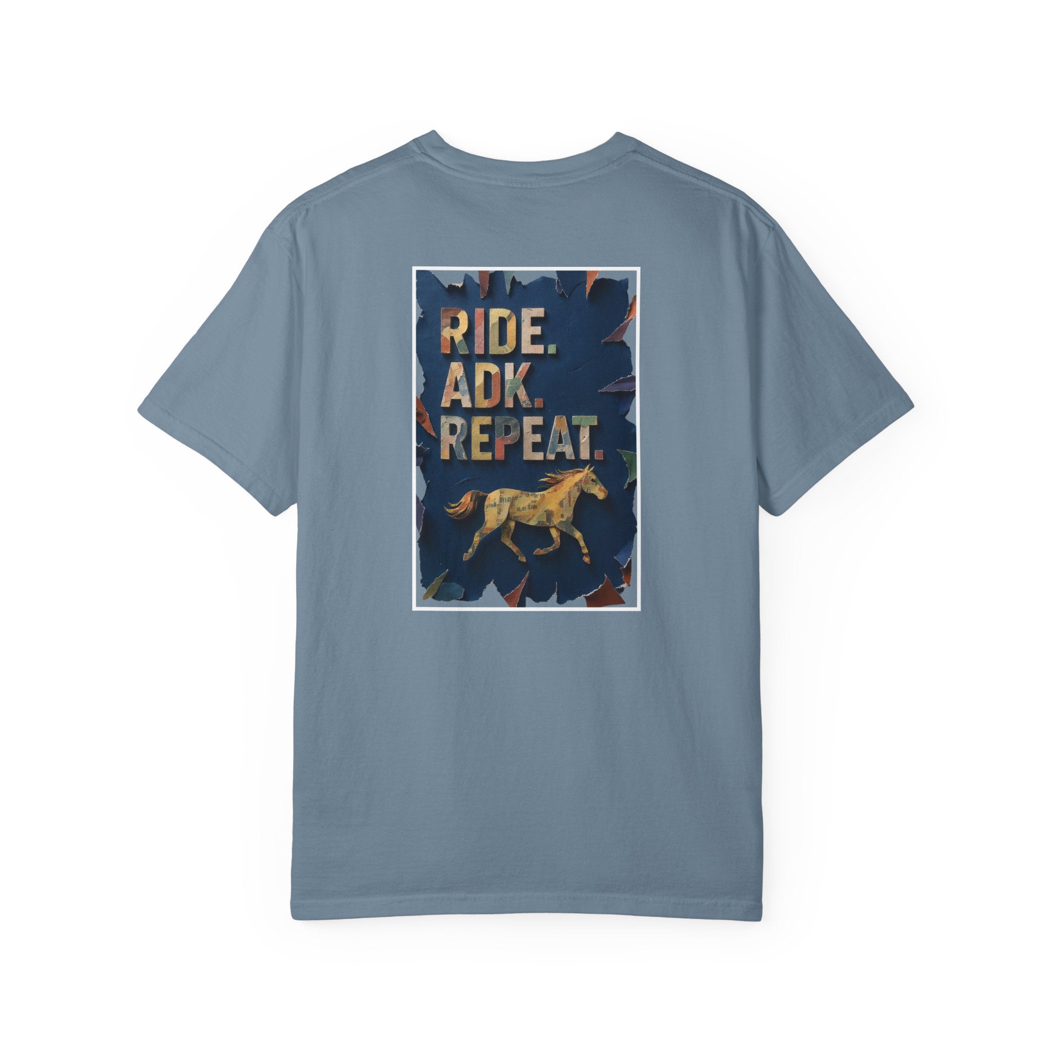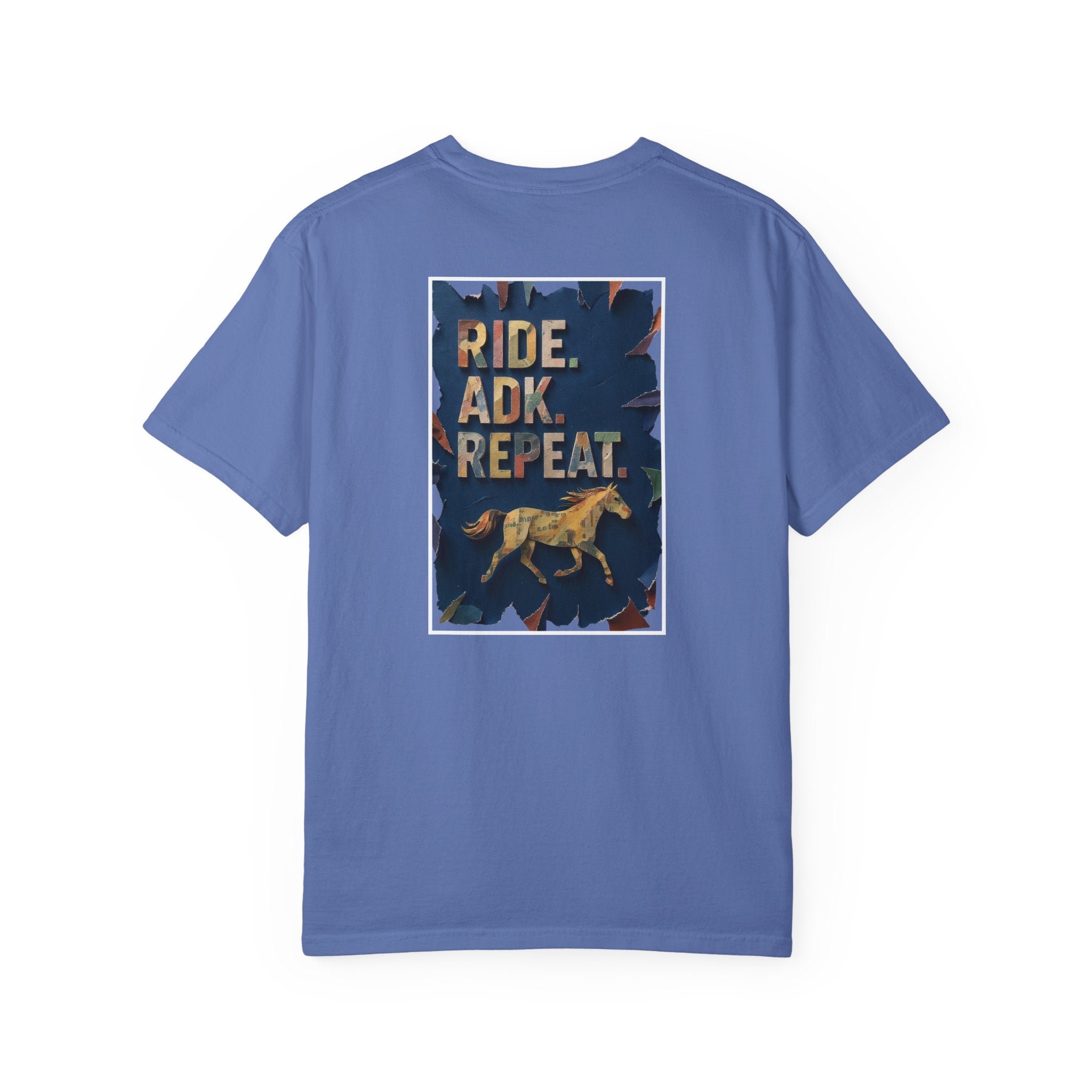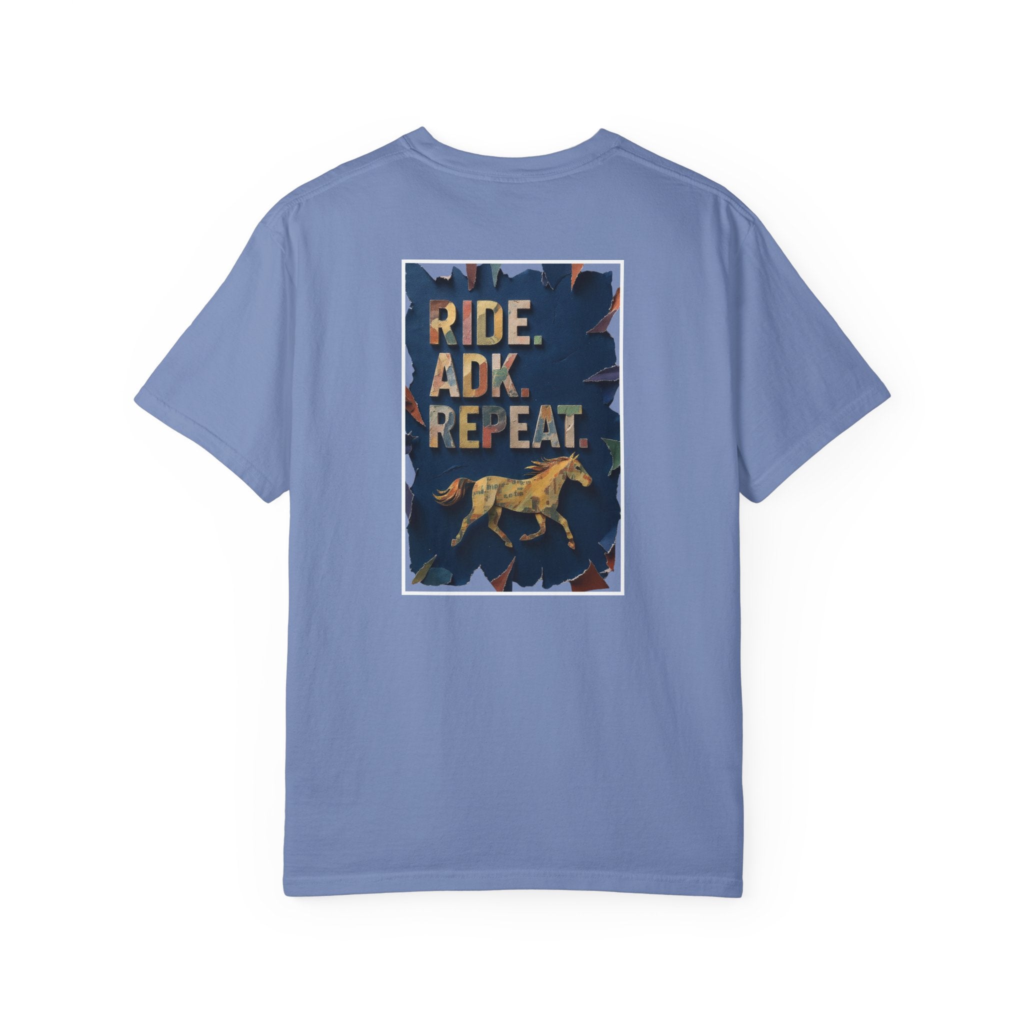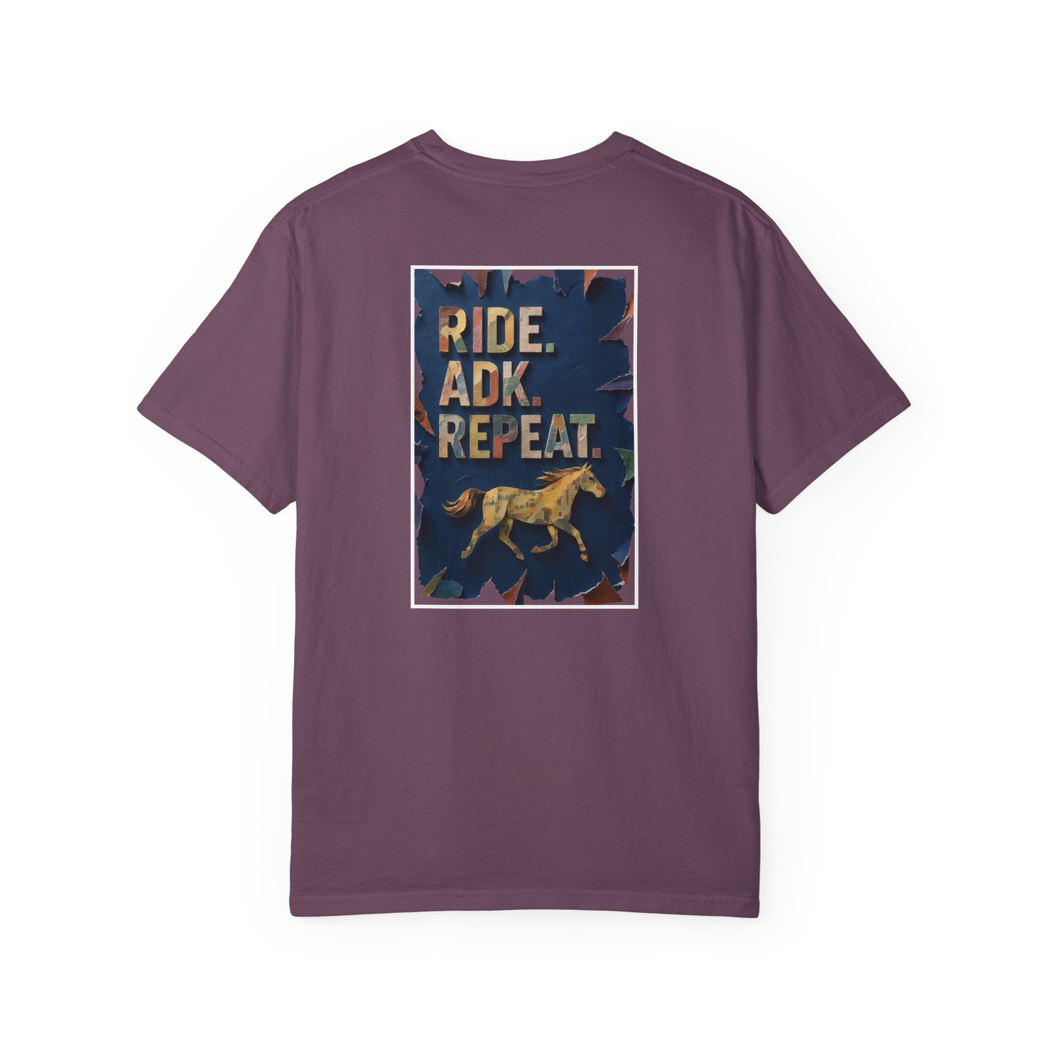 This Comfort Colors tshirt with Ride. ADK. Repeat. on the front and a horse graphic on the back is the perfect shirt for the Adirondack horse lover! This shirt has a relaxed fit and midweight cotton make this shirt an easy go-to for post-ride hangs, campsite coffee, or errands after a long day on the trail.