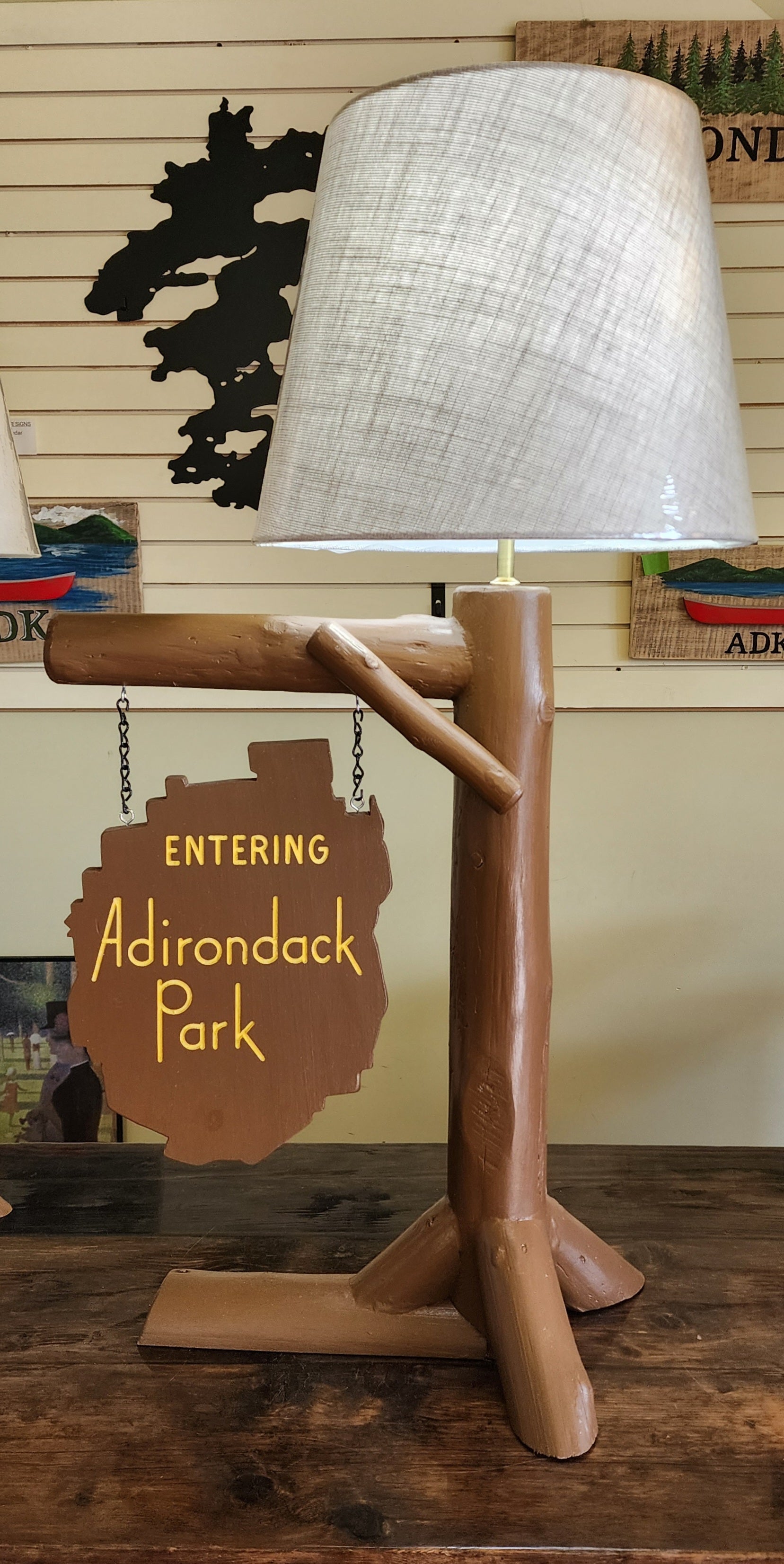 This custom lamp is a mini replica of the sign we all love so much! Made from Cedar, in the Adirondack Park sign traditional colors.