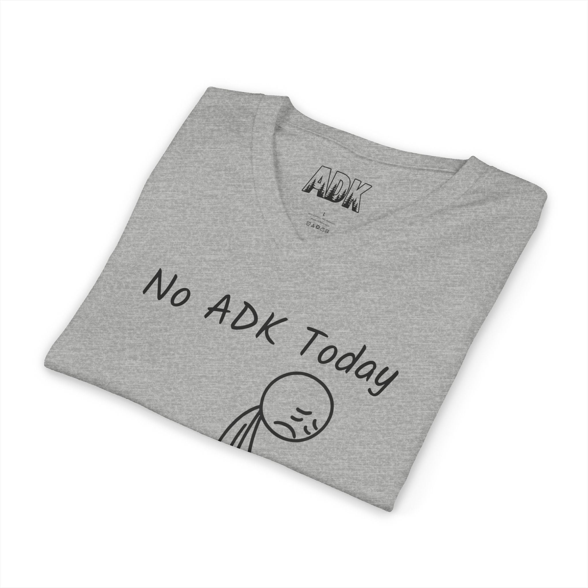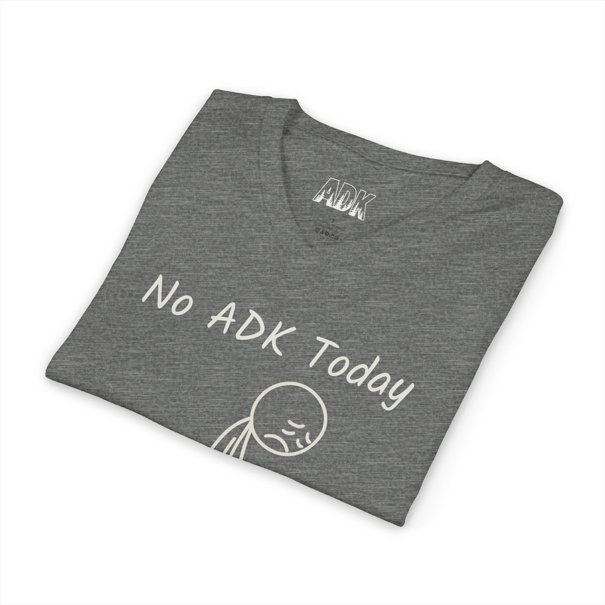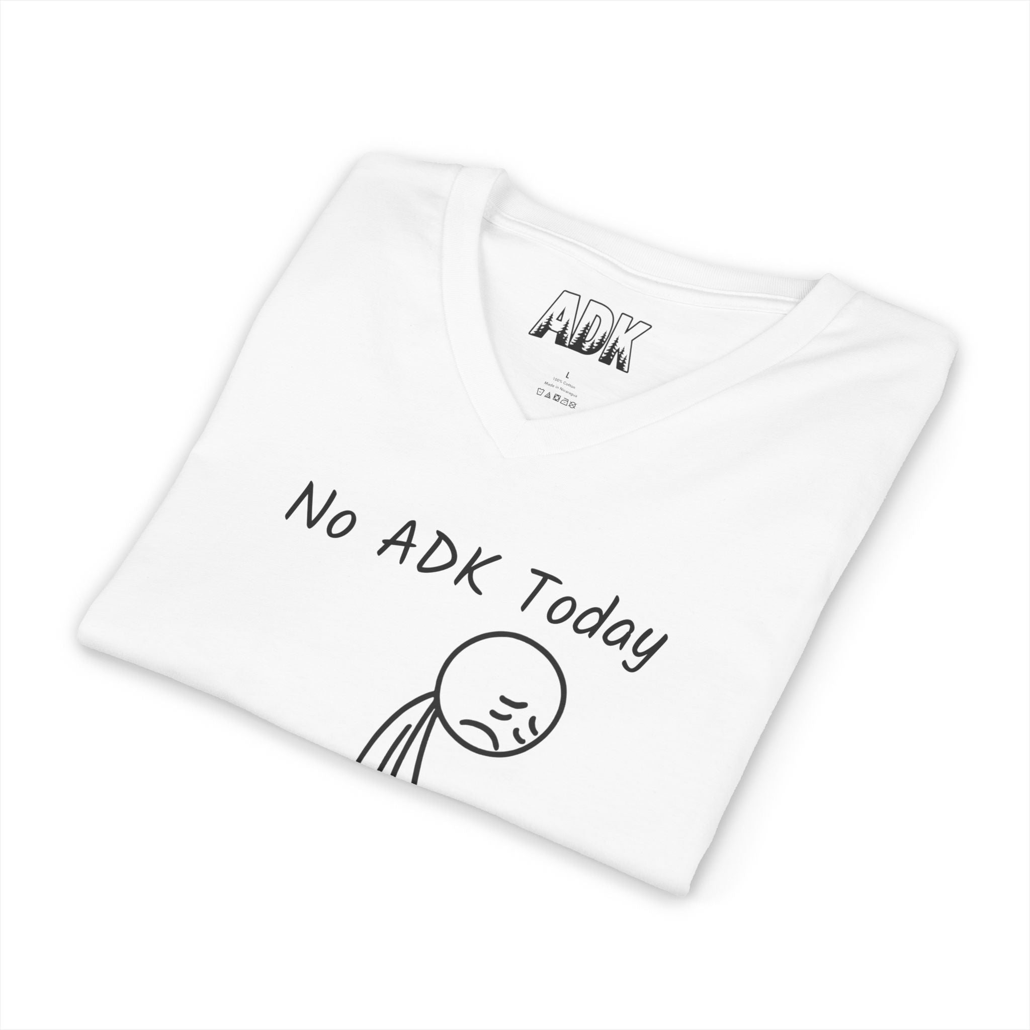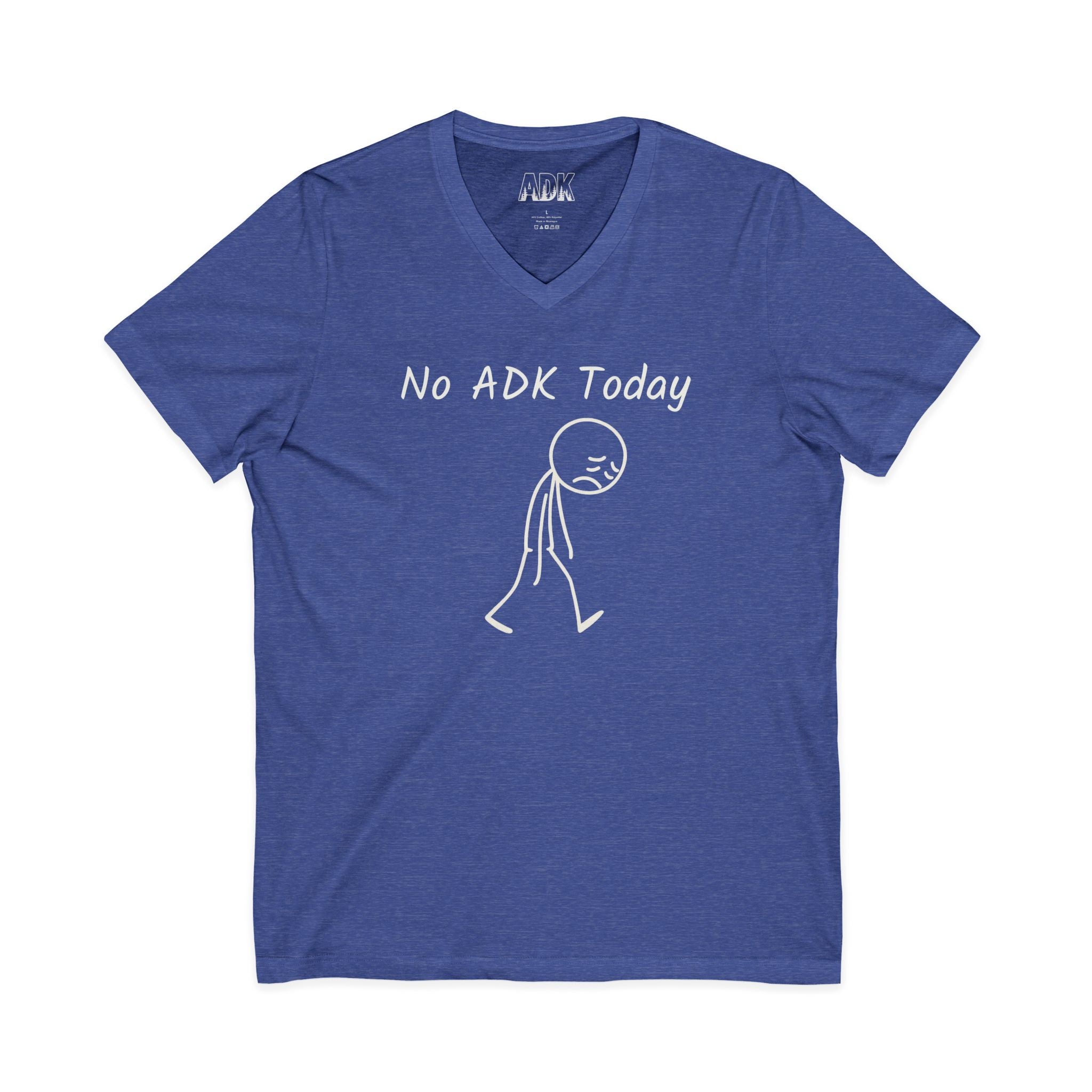 This Bella+Canvas lightweight V-neck consists of a hand-drawn stick-figure slumps beneath the words “No ADK Today,” a small, relatable shrug for those of us who miss the Adirondacks. ADK with pine trees in the inner neck area.